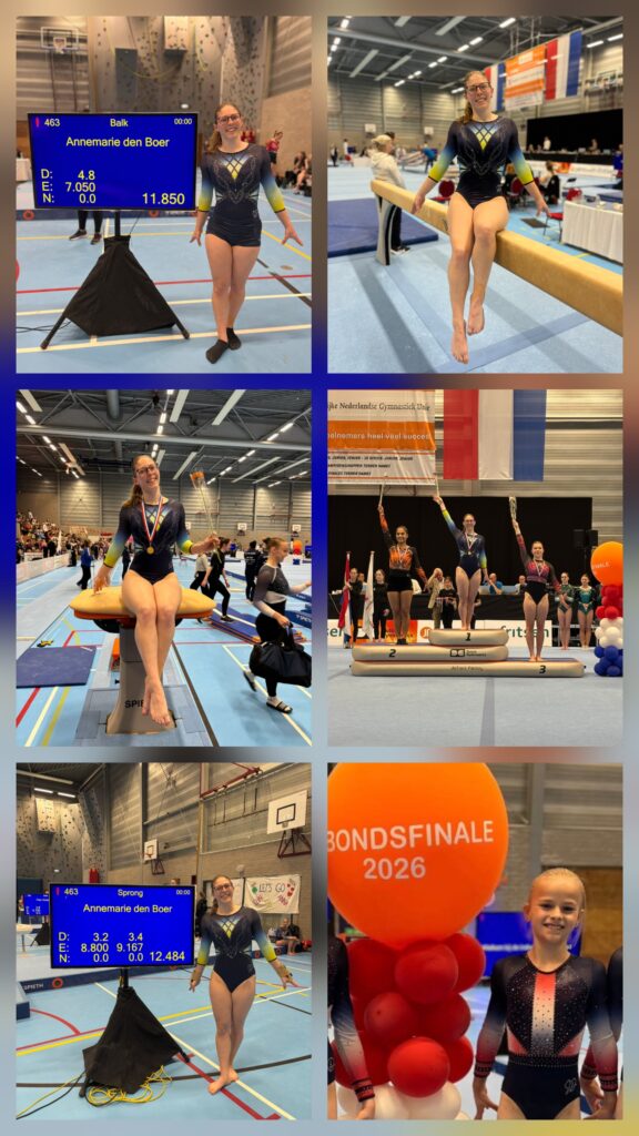 Een grote lach en een gouden medaille voor Annemarie! Zaterdag 31 januari wordt de tweede wedstrijd Supplement C in Amsterdam geturnd, Annemarie komt namens Unitas in actie. Helaas kan Linda nog niet meedoen door de eerder opgelopen blessure. Starten op balk is altijd lastig, na de val van de balk heeft Annemarie de zenuwen onder controle en scoort ze het hoogste cijfer van de wedstrijd, 10.65. Op vloer een prachtige oefening met grote sprongen en grote bewegingen met een 10.75 als resultaat. De sprong was huizenhoog en we dachten zelfs even voor de gehoekte tsukahara een 13.00, maar dat bleek een typefoutje. Annemarie scoort een 11.90 voor de gehurkte en een 12.50 voor de gehoekte tsukahara. Als laatste een strakke brugoefening met een nieuwe opsprong. Ook op brug haalt Annemarie het hoogste cijfer van de wedstrijd, een 10.55.Al met al goed genoeg voor de gouden medaille in de meerkamp!Daarmee plaatst Annemarie zich voor de meerkampfinale op zondag 22 maart en voor de brug, balk en sprongfinale op 21 maart! Ook mag Annemarie op 28 of 29 maart in actie komen tijdens de landelijke halve finale in Vianen.