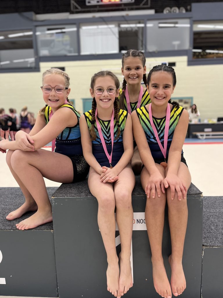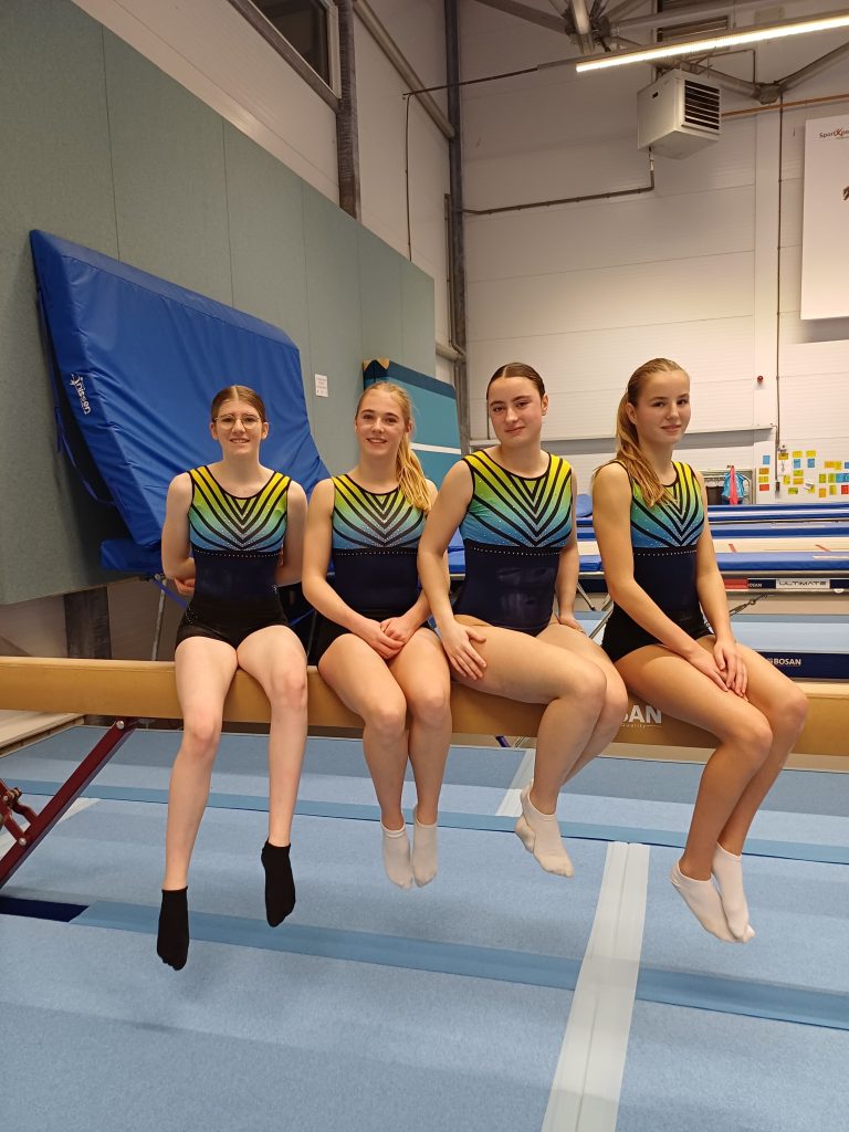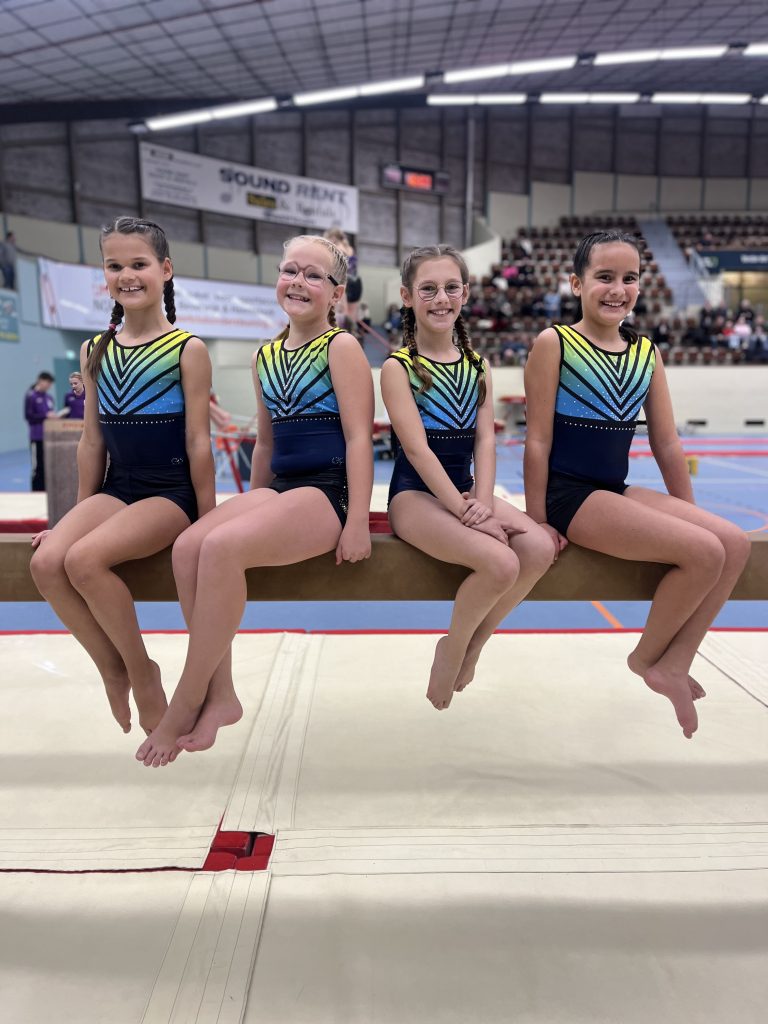 Ook Nayeli, Noor, Senna en Jasmijn hebben hun eerste wedstrijd geturnd! De oefeningen op vloer lukte heel goed, met een arabier flikflak voor Senna en voor Jasmijn en Nayeli een mooie overslag. Bij de sprong maakte Noor maakte een prachtige handstandplatval, en ook die van de anderen waren heel erg mooi! De brugoefeningen gingen goed achter elkaar door. Alle koprollen op de balk zijn gehaald en daarmee hebben ze als kers op de taart, een 3e plek met een gouden randje behaald.